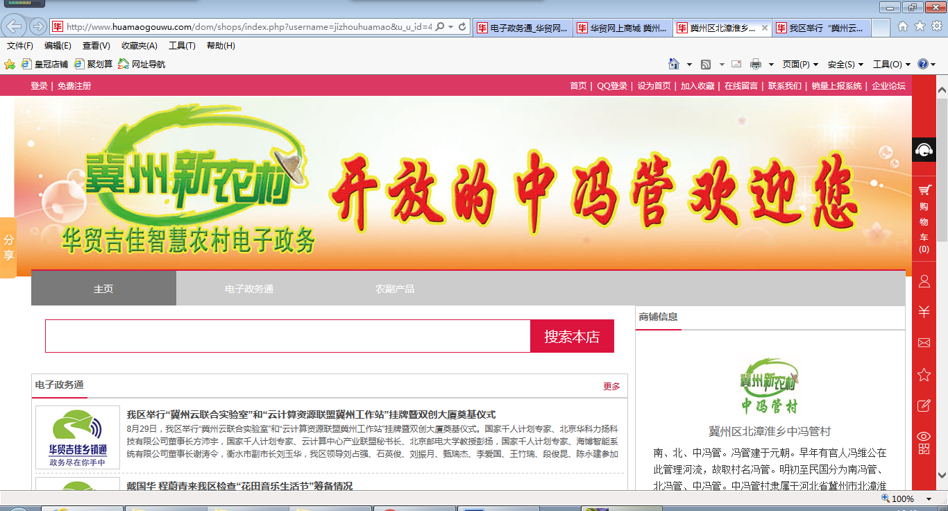 近期衡水市冀州区华贸吉佳农村电子商务运营中心经过了6个月的开发开通了冀州首个农村电子政务+农村电子商务运营平台,这个平台的开通标志着冀州发展农村电子商务的步伐,开通以后可实现农村政务公开+农副产品销售等功能,在远方打工的农民除了在手机上可以看到老家的政务财务公开,还可以在外出打工的同时把自己老家的产品通过平台转到全国各地,手指轻松一动农副产品卖向全国。