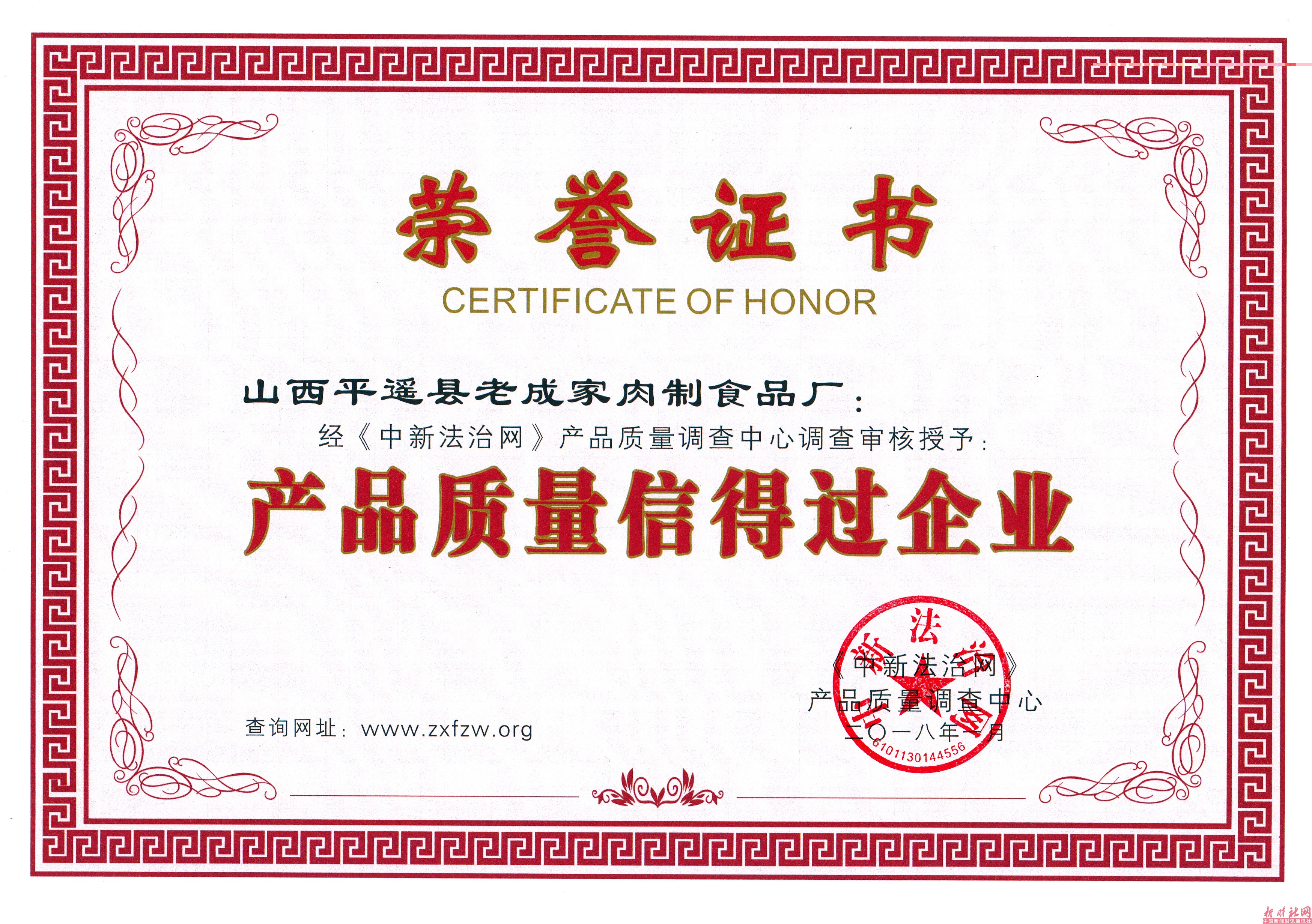 >> 山西平遥老成家肉制品厂荣获产品质量信得过企业
