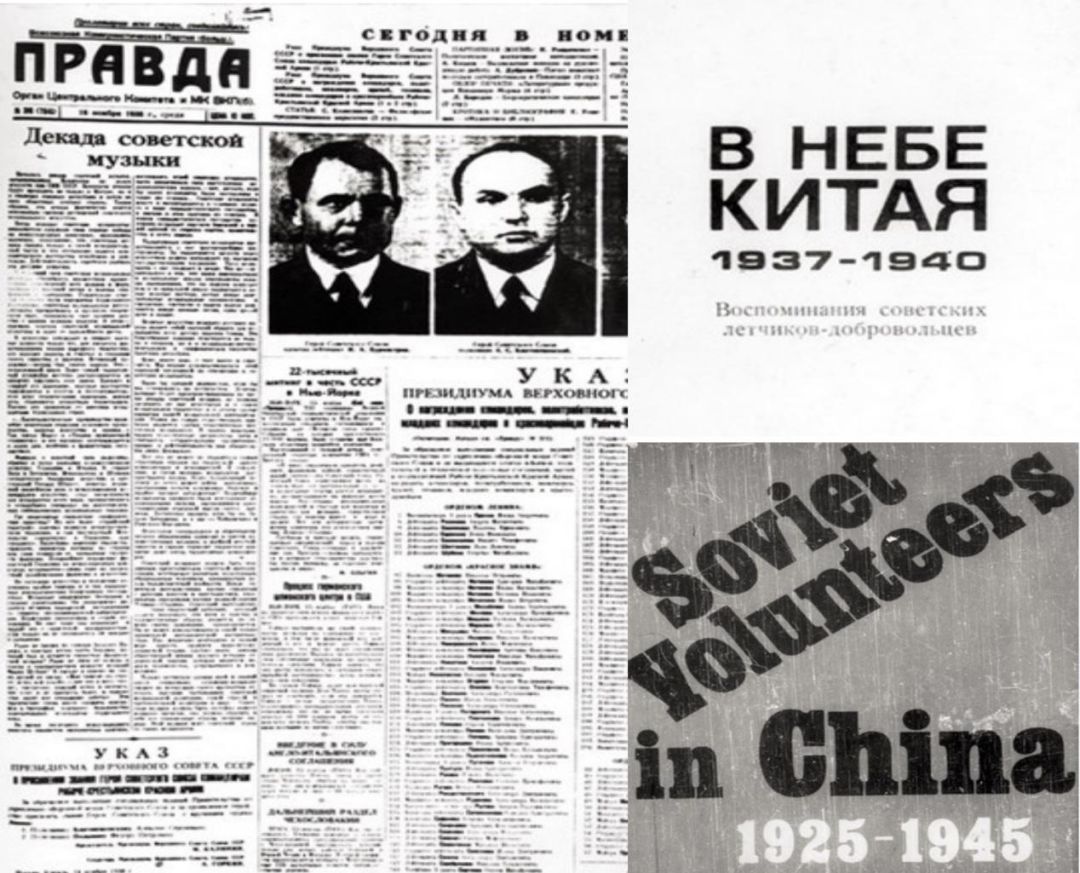 (左)1938年11月16日《真理报》发表14位援华飞行员获誉“苏联英雄”的消息;(右上)《在中国上空》:16位援华飞行员回忆录;(右下)《在华苏联志愿者(1925-1945)》:第一次国内革命战争时期在华苏联顾问及援华志愿飞行员回忆录