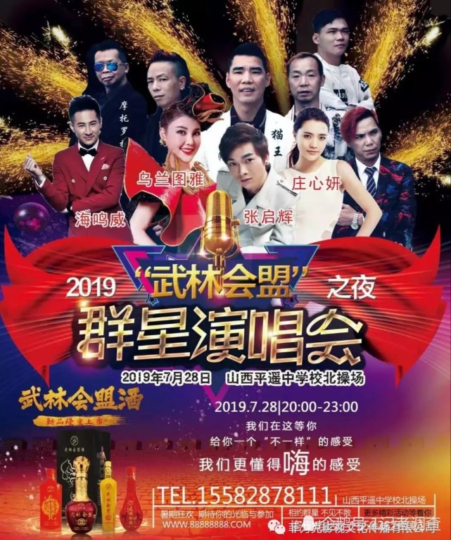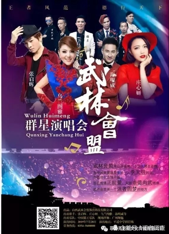 山西站站长杨文阁报道:7月28日,是一个不平凡的日子,武林会盟之夜《群星演唱会》将在世界文化遗产平遥古城隆重演出。出演歌手有:乌兰图雅、庄心妍、张启辉、海明威、中国猫王乐队等。