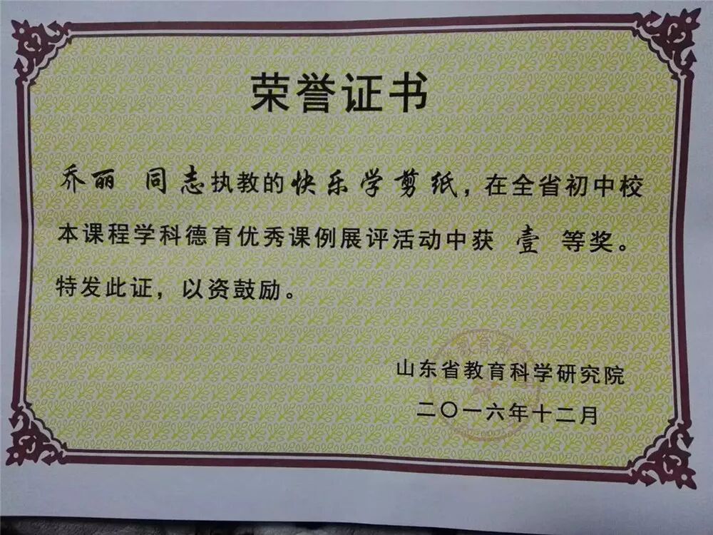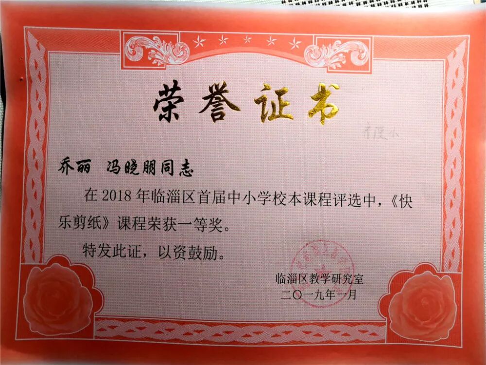 2018年,我校八名学生作品在 天津市举办的”全国少儿剪纸大赛”中获奖并在京津唐地区巡回展演。2018年12月,我校《快乐剪纸》校本课程在临淄区首届校本课程评比中获一等奖。剪纸作品获“沂蒙情全国剪纸大赛铜奖”。2019年5月,有九名学生作品在第二届“全国非遗进校园”比赛中获奖。乔丽老师的剪纸作品在2019年获“中国第七届剪纸艺术节暨全国大赛铜奖”。