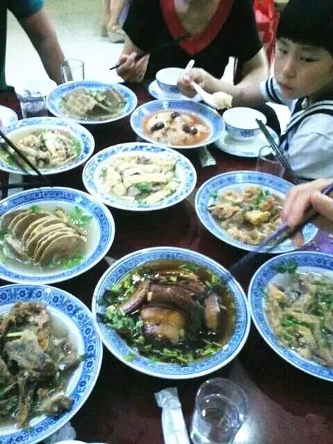 第一道:焖子 第二道:扦子 第三道:红扣肉 第四道:油炸鱼 第五道:羊肉炒白菜 第六道:甜米饭 第七道:虎皮鸡蛋 第八道:鸡丝笋 第九道:牛肉炖豆腐 第十道:全家福