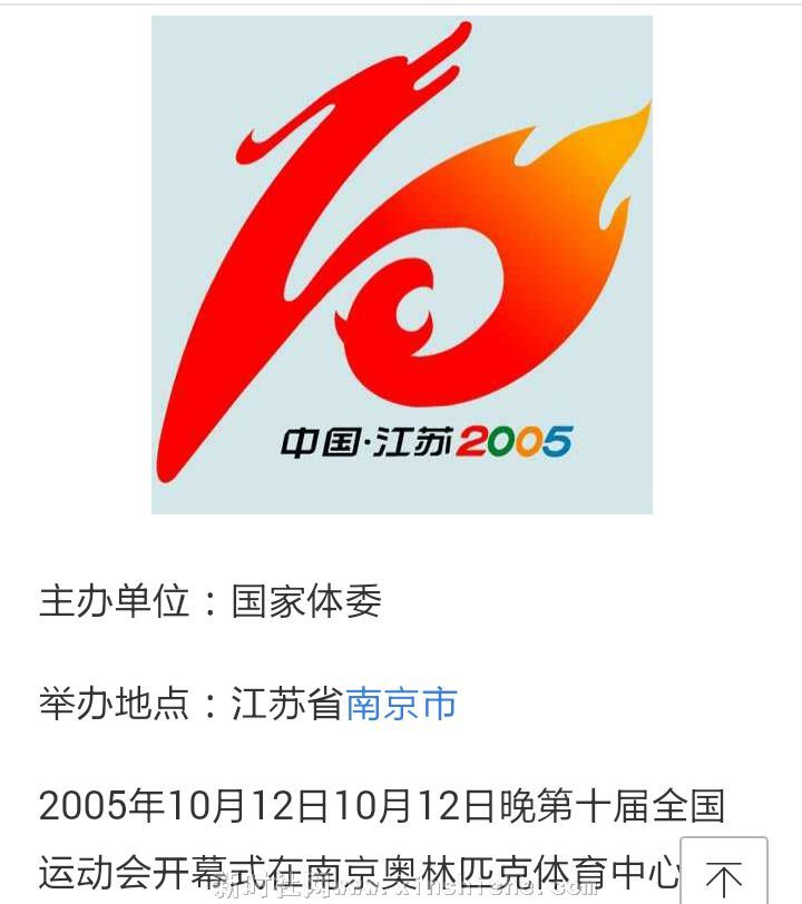 中华人民共和国第十届运动会于2005年10月12日至2005年10月23日在南京举行,这次全运会是中国第一次采用申办形式确定承办单位的综合性大型运动会。来自全国46个代表团的参赛运动员达9986人,为前十届全运会之最,江苏省代表团以56枚金牌雄居金牌榜榜首。