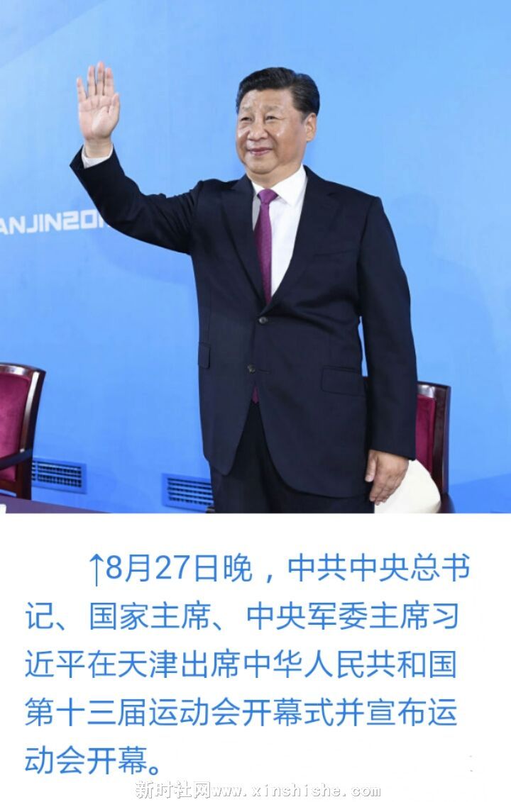 中华人民共和国第十三届运动会2017年8月27日晚在天津市隆重开幕。中共中央总书记、国家主席、中央军委主席习近平出席开幕式并宣布运动会开幕。