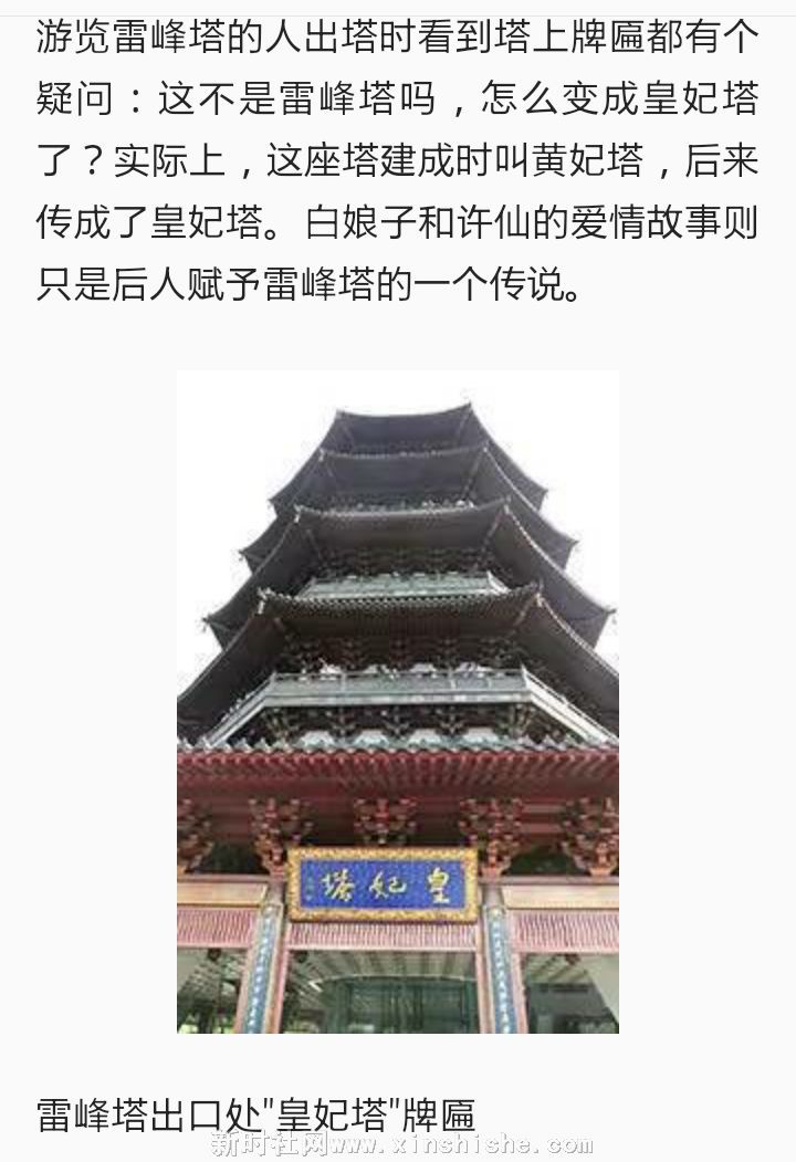 游览雷峰塔的人出塔时看到塔上牌匾都有个疑问:这不是雷峰塔吗,怎么变成皇妃塔了?实际上,这座塔建成时叫黄妃塔,后来传成了皇妃塔。白娘子和许仙的爱情故事则只是后人赋予雷峰塔的一个传说。