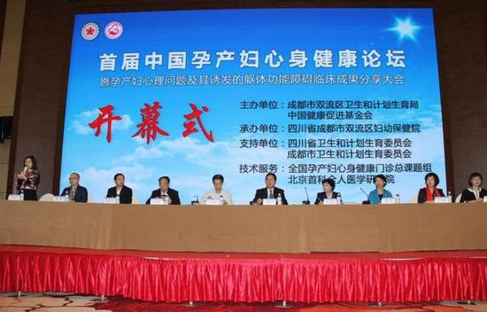 首届中国孕产妇心身健康论坛由中国健康促进基金会与四川省成都市双流区卫生和计划生育局联合主办,四川省成都市双流区妇幼保健院承办、四川省卫生和计划生育委员会与成都市卫生和计划生育委员会支持,全国孕产妇心身健康门诊总课题组与北京首科全人医学研究院提供技术服务。中国健康促进基金会常务副理事长、原二炮卫生部部长常映明,国家卫生计生委妇幼健康服务司原副巡视员张伶俐,第四军医大学第二附属医院原政委曾昭清,国家疾控中心妇幼保健在职专家李丽娟,中华医学会心身医学专业委员会主任委员吴爱勤,四川省卫生和计生委妇幼健康服务处处长杨莉,四川省成都市卫生和计划生育委员会妇幼健康服务处副处长宋建华,四川省成都市双流区卫生和计划生育局副局长郭毅,四川省成都市双流区妇幼保健院院长徐珠屏等领导和专家出席论坛并分别讲话和发言。来自天津、浙江、四川、广东、江苏、浙江、广西、河南、重庆等基层医院孕产妇心身健康门诊一线医护工作者,与来自全国300多名医院围产保健和产科医护人员进行了孕产妇心身障碍临床经验分享。