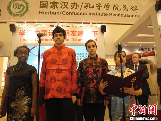 资料图:英国的孔子学院学生伦敦书展现场朗诵中文诗词。中新社发 应妮 摄