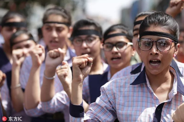 当地时间4月17日,印度阿姆利则,民众示威游行,抗议强奸案。近日,发生在北方邦和印控克什米尔地区的两起恶性强奸案令印度民怨沸腾,多地民众持续举行抗议活动。