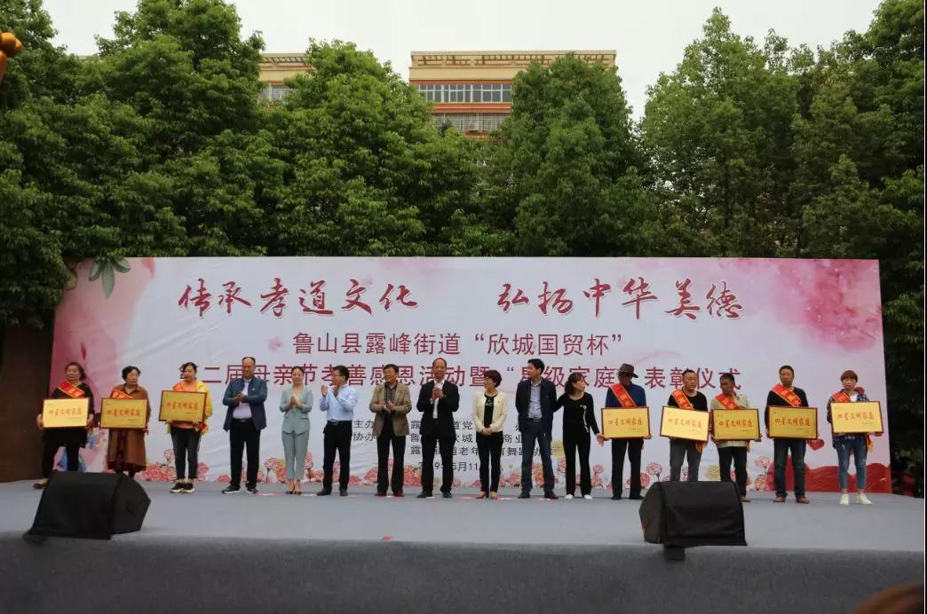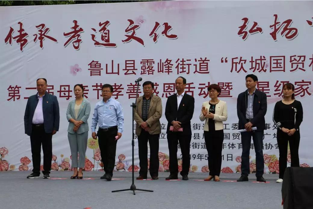 5月11日上午由露峰街道党工委、办事处主办,鲁山县欣城国贸商业广场、露峰街道老年体育舞蹈协会协办的传承孝道文化,弘扬中华美德,鲁山县露峰街道“欣城国贸杯”第二届母亲节孝善感恩活动暨“星级家庭”表彰仪式在中心公园举行。鲁山县人大常委会副主任、县总工会主席王三槐;县政法委副书记尹禄军;县妇联主席盛彩虹;县文明办主任刘阿蕊;露峰街道党工委书记邵文斌;露峰街道党工委副书记、办事处主任陈军利;露峰街道党工委副书记郝泉水;露峰街道党工委委员、组织委员宋斌辉出席会议。十八大以来,习近平总书记在不同场合多次谈到要“注重家庭、注重家教、注重家风”,强调“家庭的前途命运同国家和民族的前途命运紧密相连”。此次活动的举办是培养子女以孝为核心的伦理道德体系,更兼以悌、忠、信、礼、义、廉、耻,让继承的后人懂得感恩,孝敬父母,回报社会为人民谋福。